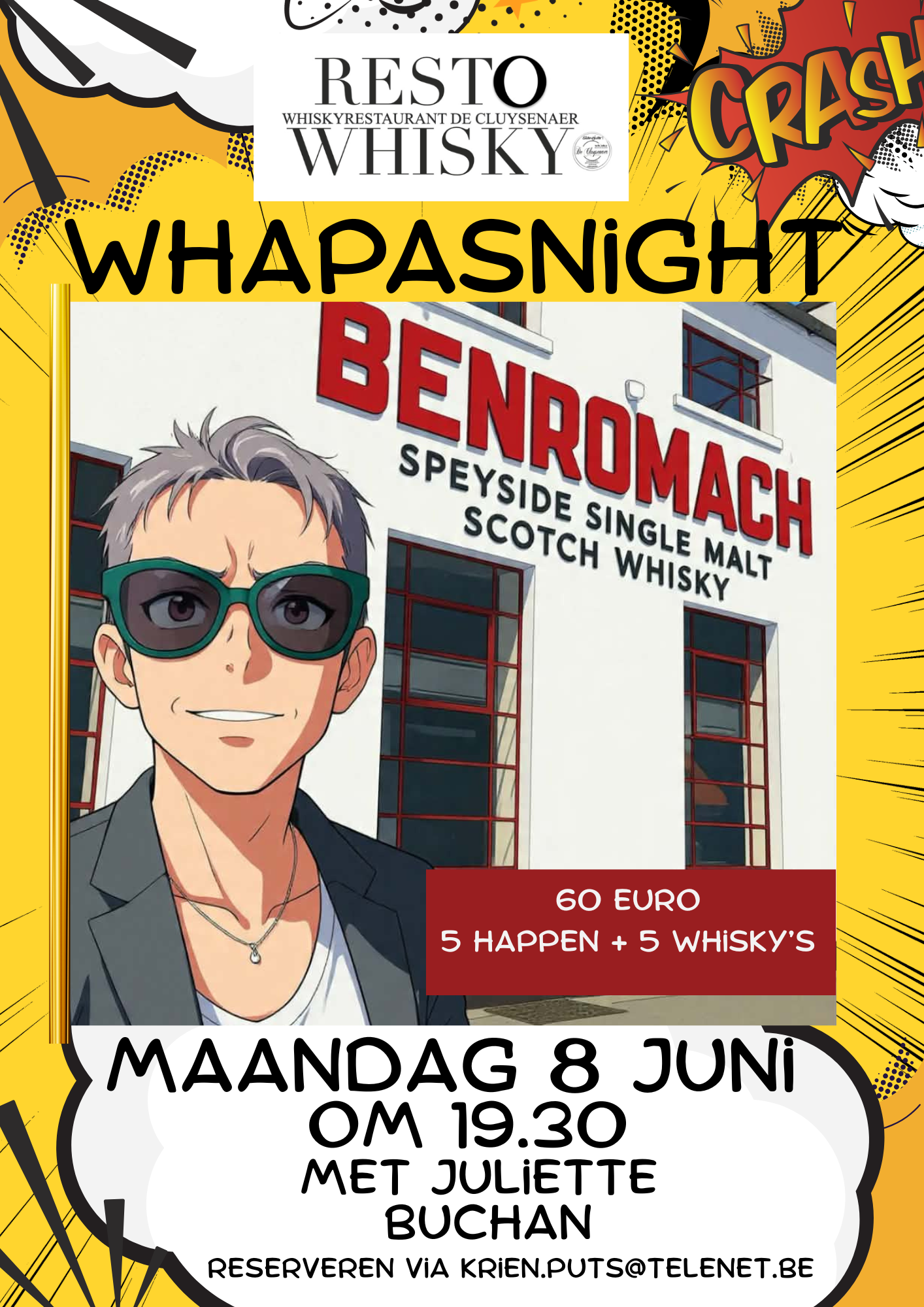 Bijpassende whisky's en bijpassende verhalen en uitleg. Voor wie geen whisky lust kan het menu ook verkregen worden met een arrangement whisky of een bob - arrangement. Reservatie verplicht